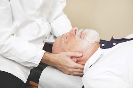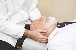 Closeup of a chiropractor adjusting a senior patient’s cervical spine (neck).
